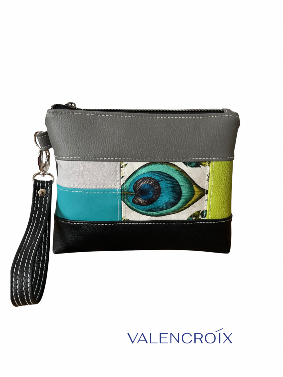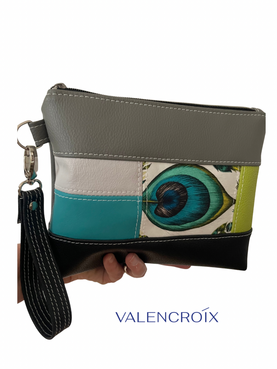Pochette réalisée à partir d’un assemblage réfléchi de matières et de couleurs, choisi pour créer un équilibre visuel harmonieux.